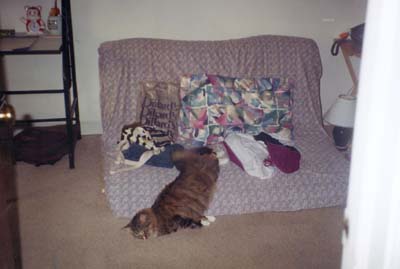 Another way to stretch his body is to lay down along a wall, I mean literally! All his body, from foretoe to hind toe, is straight along the wall. But the funniest thing is that Alto can sleep still in this position for hours! You may not believe me, but believe me, it's true! I personally have never seen a cat like this before...